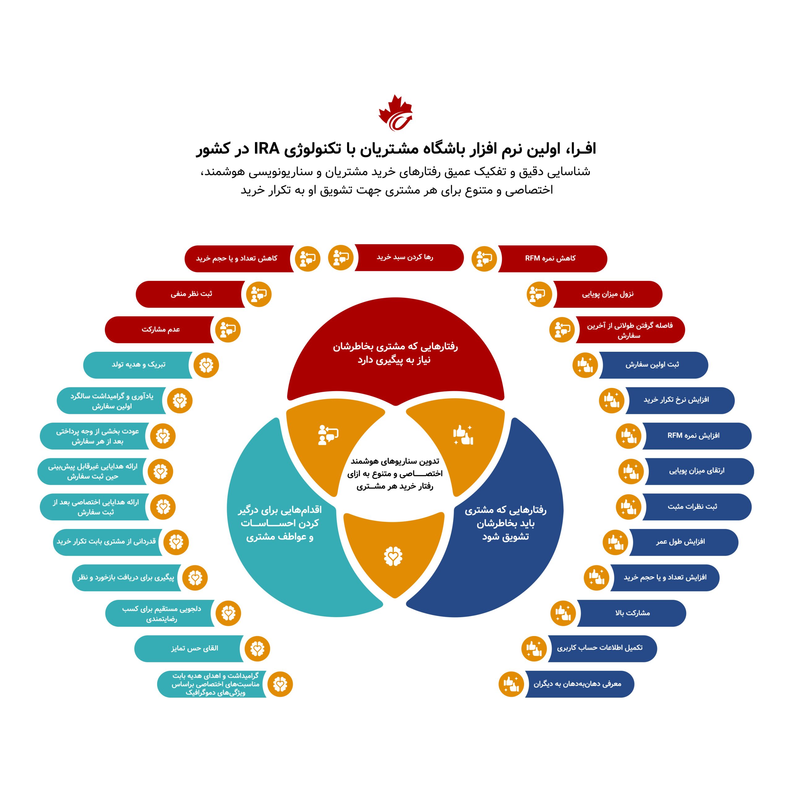 افرا به کمک تکنولوژی IRA، ابتدا به کشف و شناسایی هوشمند و دقیق و تفکیک رفتارهای خرید هر مشتری پرداخته و در نهایت براساس آنالیز دادههای به دستآمده اقدام به تدوین هوشمندانه سناریوهای اختصاصی و متنوع به ازای هر رفتار خرید هر مشتری کرده و به اجرای خودکار آنها میپردازد تا مشتریان به تکرار خرید تشویق و ترغیب شوند!