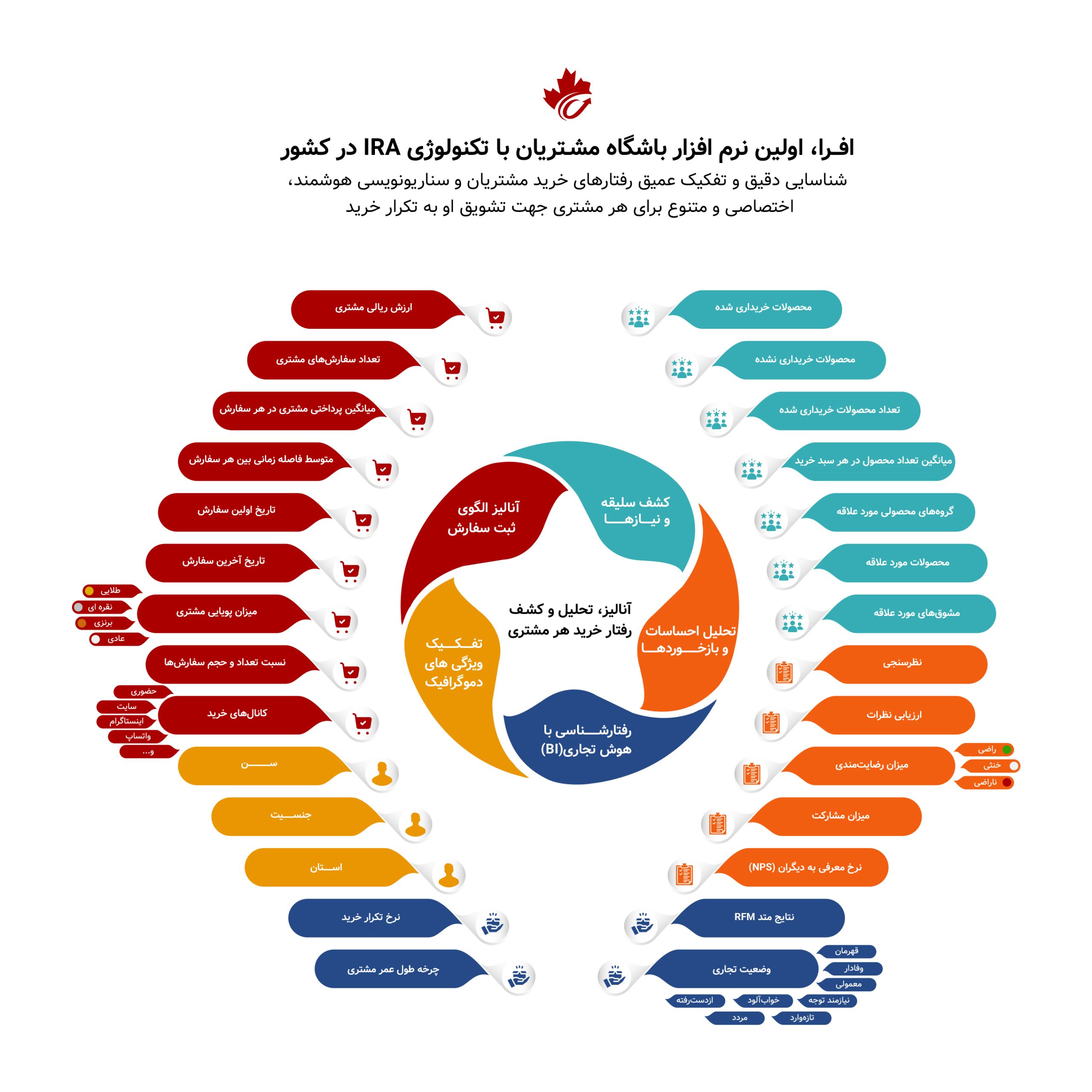 افرا اولین نرمافزار باشگاه مشتریان در کشور است که برپایه تکنولوژی IRA توسعه یافته و به طور هوشمند براساس تحلیل و شناسایی رفتار خرید هر مشتری، سناریوها و واکنشهای اختصاصی برای هر مشتری تدوین و اجرا میکند تا در قدم اول نرخ وفادارسازی و در نهایت، نرخ تکرار خرید مشتریان را افزایش دهد.